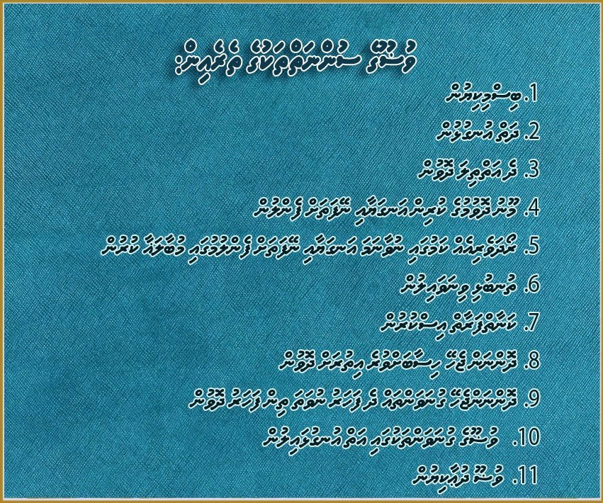 8- ޥުޟޫކޮށް ނިމިގެން ކިޔަން ވާރިދުވެފައިވާ ދުޢާ ކިޔުން: ރަސޫލުﷲ ޞައްލަﷲ ޢަލައިހި ވަސައްލަމަ ޙަދީޘްކުރެއްވިއެވެ. (( مَا مِنْكُمْ أَحَدٌ يَتَوَضَّأُ فَيَسْبِغُ الوُضُوءَ ثُمَّ يَقُولُ: أَشْهَدُ أَنْ لاَّ إِلَهَ إِلاَّ اللهُ وَحْدَهُ لاَ شَرِيْكَ لَهُ وَأَشْهَدُ اَنَّ مُحَمَّدًا عَبْدُهُ وَرَسُوْلُهُ ،إِلاَّ فُتِحَتْ لَهُ أَبْوَابُ الْجَنَّةِ الثَّمَانِيَةِ، يَدُخُلُ مِنْ أَيِّهَا شَاءَ)). [أخرجه مسلم برقم (234) وزاد الترمذي: ((اللهم اجعلني من التوابين واجعلني من المتطهرين) برقم (55) وصححه بهذه الزيادة الألباني (الإرواء برقم 96). މާނައީ: “ތިޔަބައިމީހުންކުރެމީހަކު އޭނާ އެންމެފުރިހަމަގޮތުގައި ވުޟޫކޮށް، أَشْهَدُ أَنْ لاَّ إِلَهَ إِلاَّ اللهُ وَحْدَهُ لاَ شَرِيْكَ لَهُ وَأَشْهَدُ أَنَّ مُحَمَّدًا عَبْدُهُ وَرَسُوْلُهُ (މާނައީ: “ﷲ މެނުވީ އަޅުކަންވެވުން ޙައްޤުވެގެންވާ އެހެންއެއްވެސް އިލާހަކުނުވާކަމަށާއި، އެއިލާހުގެ އެއްކައުވަންތަކަމަށާއި، އެއިލާހަށް އެއްވެސް ޝަރީކަކުނުވާކަމަށް އަޅުހެކިވަމެވެ. އަދި މުޙައްމަދުގެފާނީ އެއިލާހުގެ އަޅާކަމަށާއި އެއިލާހުގެ ރަސޫލާކަމަށް އަޅުހެކިވަމެވެ.) މިފަދައިން ކިޔައިފިނަމަ، އޭނާއަށްޓަކައި ސުވަރުގޭގެ އަށްދޮރު ހުޅުވޭނެއެވެ. އޭގެން އޭނާ ބޭނުން ދޮރަކުން އޭނާއަށް ވަދެވޭނެއެވެ.”