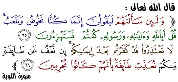 ﴿قُلْ أَبِاللَّهِ وَآيَاتِهِ وَرَسُولِهِ كُنْتُمْ تَسْتَهْزِئُونَ لَا تَعْتَذِرُوا قَدْ كَفَرْتُمْ بَعْدَ إِيمَانِكُمْ ﴾ [التوبة :65-66 ] މާނައީ: “ކަލޭގެފާނު ވިދާޅުވާށެވެ! ތިޔަބައިމީހުން ތިޔަ މަލާމާތްކޮށް އުޅެނީ ﷲއަށާއި އެއިލާހުގެ އާޔަތްތަކަށާއި އެއިލާހުގެ ރަސޫލާއަށް ހެއްޔެވެ؟ ތިޔަބައިމީހުން ބަހަނާ ނުދައްކާށެވެ! ތިޔަބައިމީހުން އީމާންވުމަށްފަހު، ތިޔަބައިމީހުން ތިޔަތިބީ ކާފިރުވެފައިކަން ކަށަވަރެވެ.”