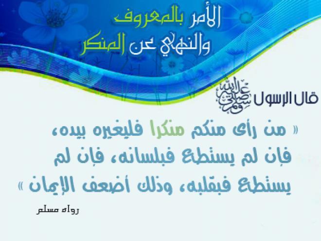 (مَنْ رَأَى مِنْكُمْ مُنْكَرًا فَلْيُغَيِّرْهُ بِيَدِهِ فَإِنْ لَمْ يَسْتَطِعْ فَبِلِسَانِهِ فَإِنْ لَمْ يَسْتَطِعْ فَبِقَلْبِهِ وَذَلِكَ أَضْعَفُ الْإِيمَانِ) (1)