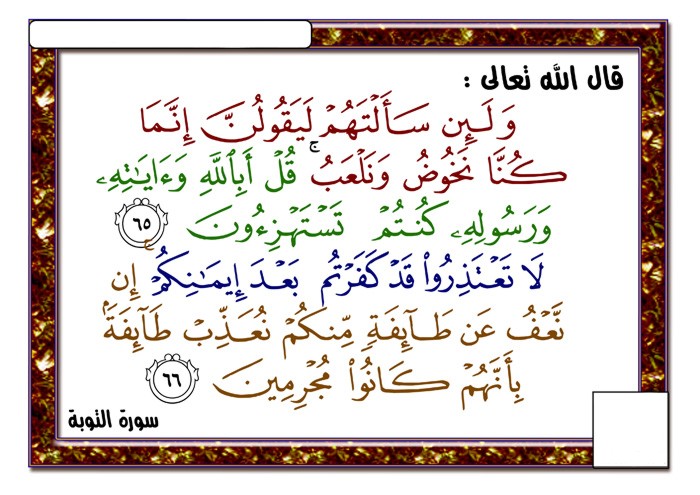 (قُلْ أَبِاللَّـهِ وَآيَاتِهِ وَرَسُولِهِ كُنتُمْ تَسْتَهْزِئُونَ (٦٥) لَا تَعْتَذِرُوا قَدْ كَفَرْتُم بَعْدَ إِيمَانِكُمْ) (1)