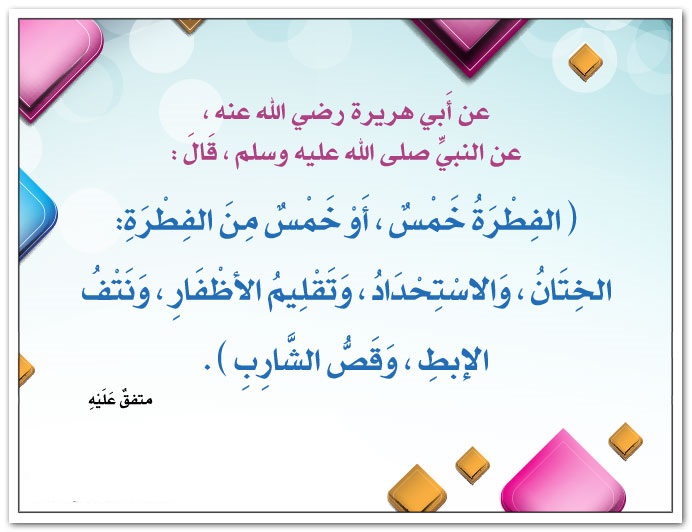 عَنْ أَبِي هُرَيْرَةَ رَضِيَ اللهُ عَنْهُ قَالَ: قَالَ رَسُولُ اللِه صَلَّى اللهُ عَلَيْهِ وَسَلَّمَ: ((خَمْسٌ مِنَ الْفِطْرَةِ: الاِسْتِحْدَادُ، وَالْخِتَانُ، وَقَصُّ الشَّارِبِ، وَنَطْفُ الإِبْطِ، وَتَقْلِيْمُ الأَظَافِرِ )) [متّفق عليه: رواه البخاري برقم (5889)، ومسلم برقم (257).]
